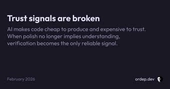Right, I guess I’m more taking issue with the article than with you, because the “trail” is always documents, and it’s pretty easy for LLMs to fake documents. I mean, humans have been half-assing verification checks for decades, and it has kind of worked because even half-assing a verification document has required at least some fluency with the code under test, which in turn has required the engineering team to develop enough understanding of the code that they can maintain it, just to produce plausible verification trail documents. Now, the relationship between plausible documentation and a dev’s understanding of the code being verified is much less reliable, so we need more precise mechanisms. In other words, the signals of trust have always been broken, it’s just that it hasn’t been a problem up until now because there were side effects that made the signals a good-enough proxy for what we actually wanted. Now that proxy is no longer reliable.